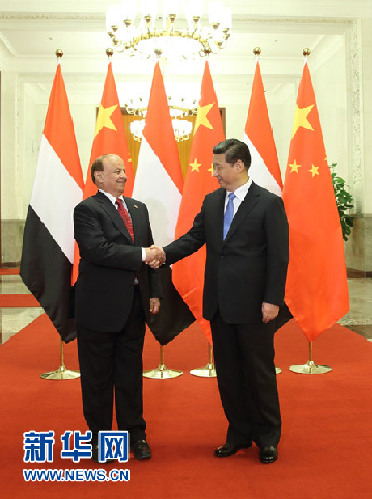 习近平强调,中方高度重视发展中也友好合作关系,尊重也门主权和独立,尊重也门人民自主选择国家发展道路,支持也门政治过渡进程和经济重建。中方愿同也方加强政府、立法机构、政党友好交往,交流治国理政经验,重点开展电力、能源、通讯、交通、基础设施建设等领域合作,在卫生、教育、文化、体育等领域向也门提供帮助。中方鼓励更多有实力的中国企业赴也门投资,希望也方为中国企业和人员提供安全、良好经营环境。中方支持也方打击恐怖主义、维护国家安全,愿加强双方反恐及打击海盗合作。中方将继续推动国际社会向也门提供支持和帮助。