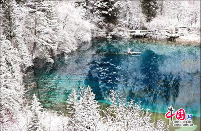 在冰雪的妆点下,九寨沟变得玲珑剔透、森林银装素裹。 色彩斑斓的海子此时有了令人惊喜的变化,蓝色的湖水上浮现出各种形状厚薄不一的洁白的冰块和冰花,有的像丝锦,有的像哈达,有的像流云,有的像青纱,妙趣天成。 树正沟、日则沟的大部分海子却不会结冰,依然泛着青、蓝、绿等不同色块。