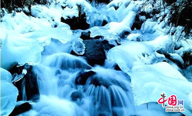 绚烂的冰瀑展示着九寨沟的冰雪风情。气势磅薄的诺日朗瀑布变成了一座巨型的艺术冰雕,落差最大的熊猫海瀑布则凝结成了巨大的冰柱。