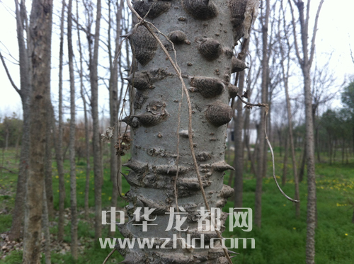 从高台上走下,记者继续行走在红花绿树之间,一棵浑身长满尖刺的大树吸引了记者的目光。只见该树有碗口粗细,全身长满了长刺,如果有人不小心碰到树干,非得扎出血来不可。“它的名字叫‘刺楸’,是我国稀有树种之一,十分罕见!”常年在森林公园看护树木的马松涛介绍,“夏天时,刺楸树上的每个刺旁边都会长出一片绿色的叶子,从远处看,整个树干被树叶包裹得严严实实。”