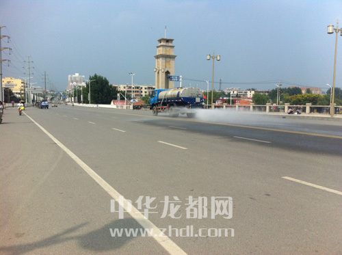 虽然已经立秋,可天气依然炎热。为此,周口市城管部门出动洒水车在街头洒水降温,以减小“秋老虎”的威力。洒水车过后,喷出的水雾让人顿时感觉一阵清凉,既有效缓解了炙热的高温环境,又起到了压尘、降温、加湿、洁净路面的功能。图为8月21日14时许,一辆洒水车在周口市区八一大道大桥洒水。