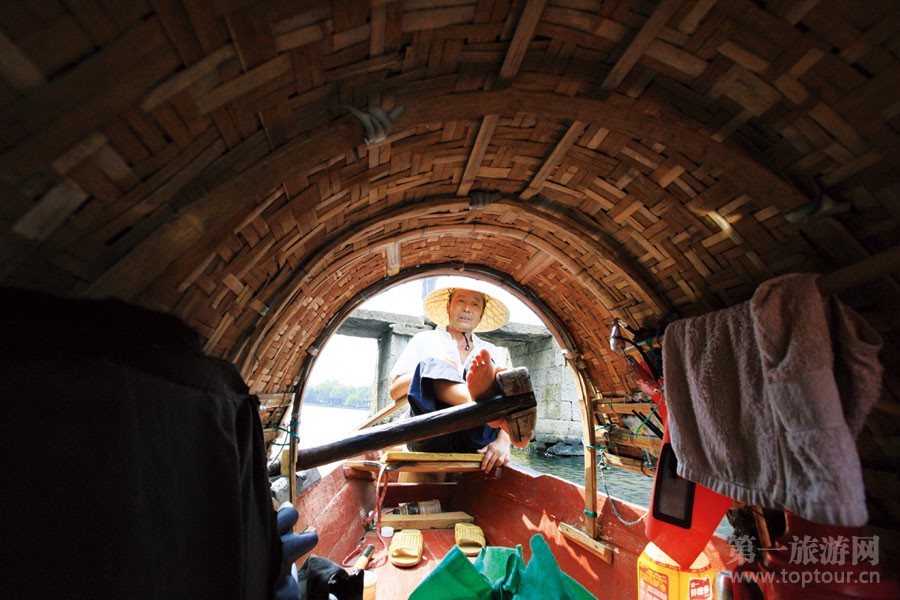“早年间绍兴人出门就遇河,多乘船代步。为了能防雨淋,就在船上安装用竹篾编成半圆形,中间嵌夹箬叶的雨篷,并用桐油,猪血,黑粉煎熬成黑油,涂在雨篷上,防止雨水渗透。由于绍兴方言中管‘黑’叫‘乌’,所以就把这种小船叫乌篷船。”陪同采访的绍兴市东湖景区管委会主任助理丁侠告诉记者。