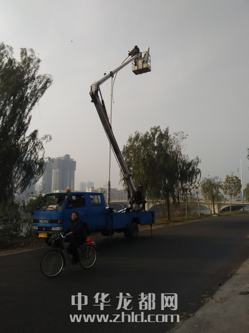 12月10日,在周口市区颍河路(八一大道至大庆路段),几名工作人员正在更换路灯。当日,虽然气温很低,但工作人员却没有因此而退缩,站在五六米高的吊车上更换路灯,以方便行人。