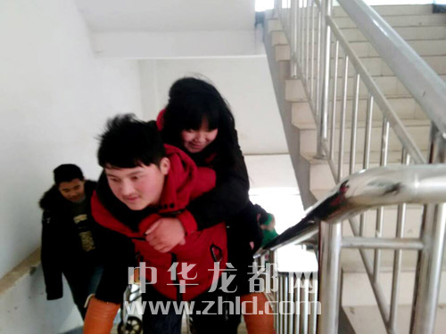 雷伟每隔几天就背一次孔雪珂,这已成了他学校生活的一部分。“除了我背孔雪珂上下楼外,我们班其他26个男生也都背过她。我作为班长,理应多做一些。”把孔雪珂安全送到教室,雷伟有点不好意思地说,“第一次背她,我有点儿害羞,但如今已经习惯了。”