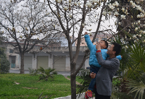 春风送暖,各种花次第开放,引得市民争相品味醉人的春色。图为昨日扶沟县一对父子在观赏盛开的木兰花。扶沟县大力开展生态林业建设,营造良好的人居环境。春天一到,鲜花斗艳,春草吐绿,处处春色醉人。(记者 王泉林 摄)