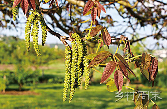 川北的核桃树多长在人家庭院或庄稼地里,东一棵西一棵,结的果子小小的,不容易剥壳,但味道极美。核桃开花是在四月,叶子刚刚冒出个小头,一串串花穗已经垂了下来,中间一条细细的花柱,四周围着碎碎的小花,活像绿色的毛毛虫。