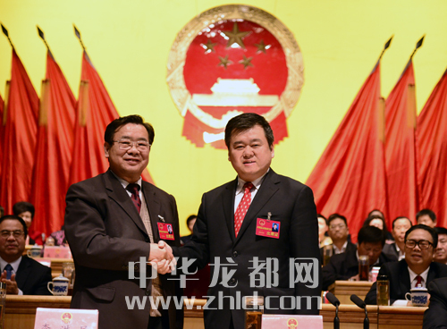 右图 新当选的市人大常委会主任徐光与李洪民亲切握手。(记者 沈湛 摄)