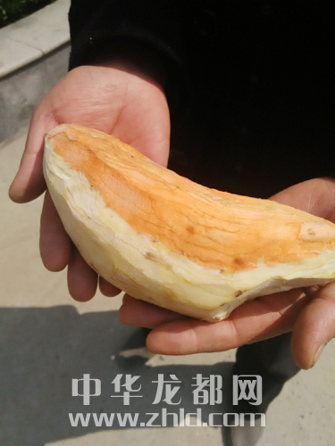 近日,淮阳县居民林树松买到了一块“混血”红薯,红薯一半是牙白色,一半是橘红色。整块红薯长约23厘米,最粗处直径约22厘米。因为担心红薯基因变异,林先生没敢食用这块红薯。为此,记者采访了周口师范学院生命科学与农学学院院长陈龙。陈教授说,红薯是块茎类作物,不像小麦、大豆那样,它不是种子,所以基本上不存在基因变异的情况。一块红薯出现两种颜色,应当是正常现象,市民可以食用。 晚报记者 朱海龙 摄