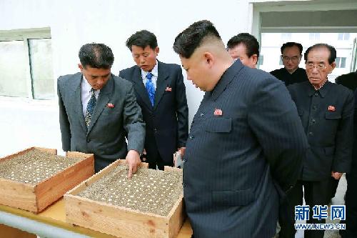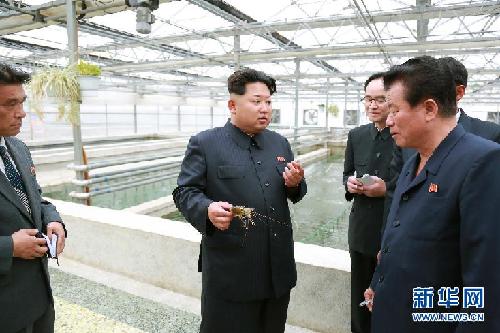这张朝中社5月19日提供的照片显示,朝鲜最高领导人金正恩(前)日前视察朝鲜大同江甲鱼养殖场,对养殖场的生产方式和工作完成情况提出严厉批评。