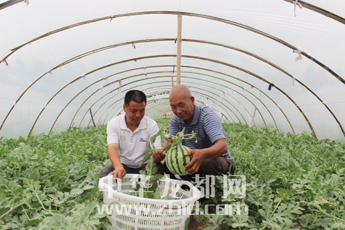近日,项城市南顿镇大棚西瓜基地开园,培育的“半截楼”8428西瓜,因果瓤脆嫩、味甜多汁走俏市场。该基地拥有大棚80多个,占地面积120多亩,亩均收入2万多元。图为该基地工作人员在采摘西瓜。 (凡景锋 摄)