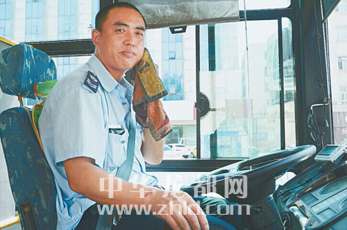 趁乘客上下车的间隙,3路公交车司机张师傅赶紧擦把汗。