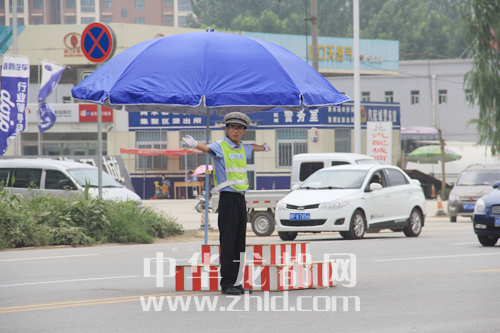 “天再热,我们也要把交通指挥好。”7月22日12时30分,在中州大道宁洛高速路口附近,正在指挥交通的交警刘保兵对记者说。记者看到,汗水已经浸透了他的衣背,蓝色的制服由浅变深。