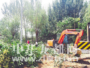 8月22日10时,记者在大庆路桥北西侧的滨河路上看到,市园林处的工作人员在平整场地、清除杂草、移栽苗木。
