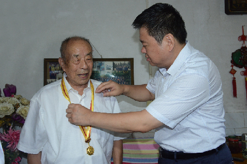 刘继标先后看望了抗战老战士王洪蟠、王彦林、代士清、王景明,亲手为他们佩戴中共中央、国务院、中共军委联合颁发的中国人民抗日战争70周年纪念章。
