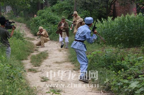周口晚报记者在拍摄现场看到,高高的玉米地里,突然冒出几个穿着军装、佩戴着枪支和刺刀的“鬼子”,还有一个“汉奸”走在前面带路。“鬼子”的头儿看着骚乱的村民怒吼道:“‘机枪手’准备,通通地杀掉!”忽然,“机枪手”被炸,“鬼子”大乱,村民四处躲藏。“啪啪”两声枪响,两个“鬼子”倒地身亡。随后,“鬼子”的头儿也头部中枪死亡……