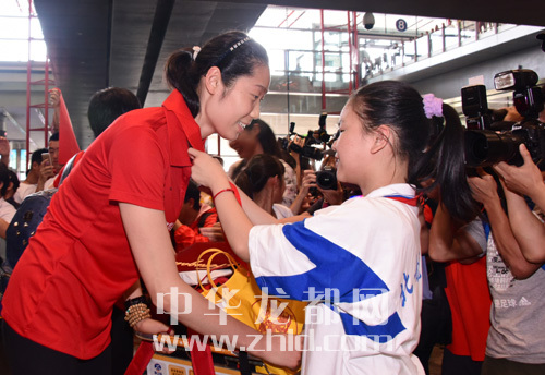 9月7日,一名学生在机场为载誉归来的朱婷佩戴红领巾。