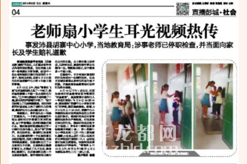 在等待调查结果的同时,记者通过网络积极寻找与该视频相关的信息。9月12日17时许,记者在当天的《彭城晚报》上看到一则标题为《老师扇小学生耳光视频热传》的消息,报纸上刊登的图片为视频中的截图。据报道,该事件发生在江苏省徐州市沛县胡寨中心小学。9月9日7时30许,胡寨中心小学老师吴某对没有完成作业的3名学生进行体罚,后被人举报。目前,涉事学校和老师已向家长和学生赔礼道歉。
