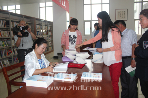 昨日16时,在市图书馆综合阅览室,市文化局曹克宏、市图书馆李佳和本报田维国、董雪丹等各单位相关负责人参加了捐赠仪式,曹克宏向柳韵颁发了爱心捐赠荣誉证书。捐赠仪式结束后,柳韵在现场举行了签字赠书活动(如图)。面对读者的热情,柳韵一一签字赠书,现场又签赠系列图书近百册。
