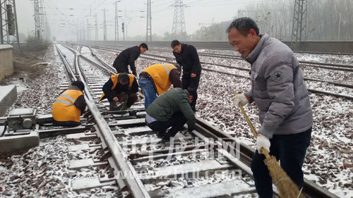 11月24日,我市迎来今冬第一场雪。为确保铁路行车安全,漯阜铁路有限责任公司组建党团员突击队清扫道岔积雪,涂油、喷洒防冻液,确保设备正常运转,同时在客运站台铺设地毯、防滑垫等,防止旅客摔伤。图为突击队队员清扫道岔积雪。