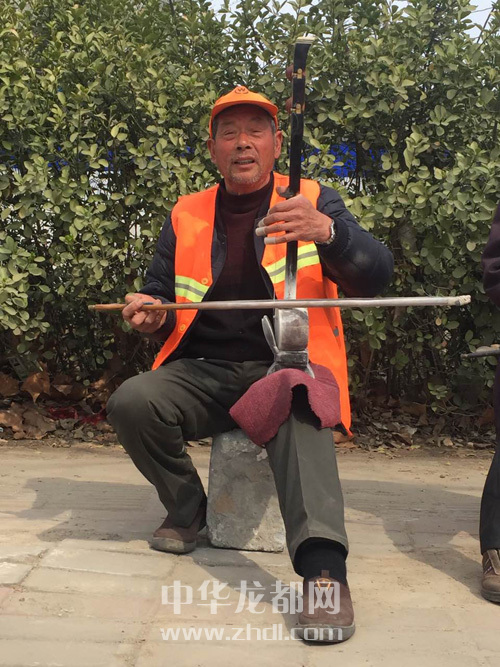 昨天上午,在东新区文昌大道与腾飞路交叉口附近,周口晚报记者找到了环卫工胡延孝,他正在全神贯注地拉着手中的板胡(如图一)。手法熟练的他神态安详,伴随着委婉动听的曲调,身体还有节奏地摇晃着。他已经完全沉浸在自己亲手拉出的优美旋律中。