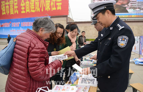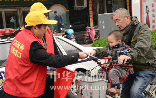 交警向市民发放宣传单,呼吁市民文明出行。