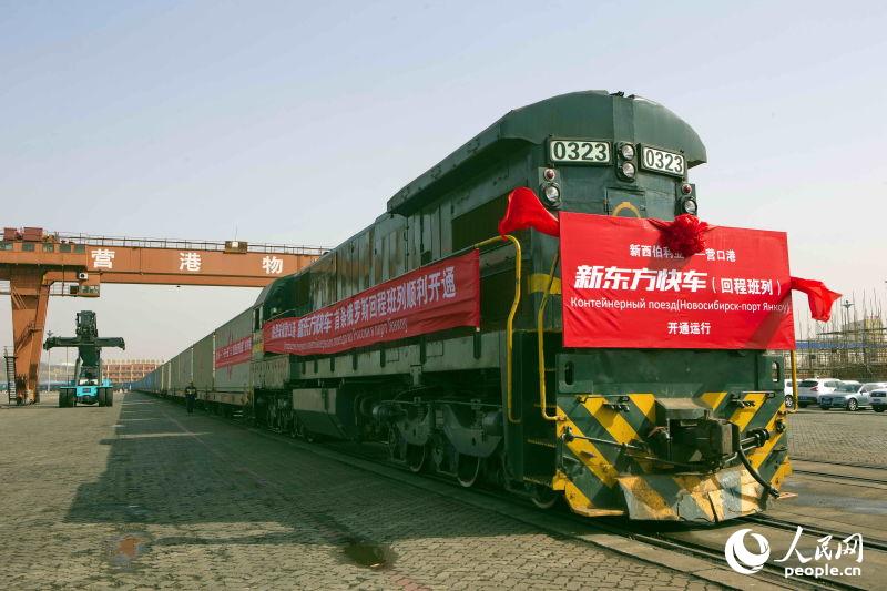 人民网营口4月9日电 (记者史家民)4月9日,随着阵阵汽笛鸣响,从俄罗斯的新西伯利亚·克列西哈发出的首趟回程中欧班列“新东方快车”、经满洲里口岸入境顺利抵达营口港。该回程班列满载45个40英尺集装箱的木制品,将以营口港为分拨中心,在鲅鱼圈口岸清关后,通过海运的方式分拨至天津、上海、广州等地。当天,就在这趟“新东方快车”到达营口港的同时,“TREST”精品班列9日上午也从营口港鲅鱼圈港区驶出。10天后,班列将抵达俄罗斯莫斯科霍夫里诺,完成6500多公里的长途跋涉。这刷新了营口港6条中欧班列线路运行速度的新纪录,成为“一带一路”上的“新东方快车”。
