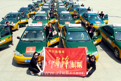 昨日上午,川汇区出租车管理站组织“雷锋车队”换发新证。为进一步贯彻落实市委、市政府关于创建省级文明城市工作的部署和要求,为中心城区市民营造安全、舒适、便捷、文明的出行环境,提升出租车行业服务水平和社会影响力,川汇区出租车管理站按照“车身、顶灯、公益广告、制服、标牌、工牌、座套”七统一标准规范行车。 记者 沈湛 摄