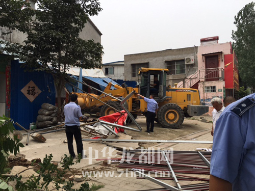 面对整治过程中不断冒出的违章建筑物,小型铲车已难以应付一些困难和复杂的场面,城管队员临时抽调了一辆大型铲车前来助阵。在五一南路麒麟建材市场附近,就有大大小小十多间违章房(棚)和多个非法广告牌。城管队员充当搬运工,不时进进出出,帮店主抬出全部物品后,铲车上场轻轻一挑、一拉、一拽,一间间看似坚硬牢固的简易房便应声倒下。
