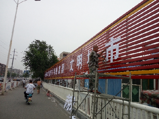 7月3日,周口晚报记者在中心城区八一大道桥北侧坡道看到,两边的护栏上安装了崭新的创建省级文明城市宣传标语,给人耳目一新的感觉。图为工人正在安装宣传标语。