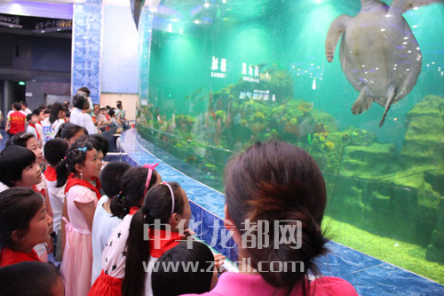 7月2日,在周口市义工协会开展的“缤纷夏日 快乐童年”公益活动中,商水黄寨半坡店小学的30名留守儿童与周口市区的30名儿童结成友谊对子。图为当日孩子们一起参观海洋馆。晚报记者 张燕 摄