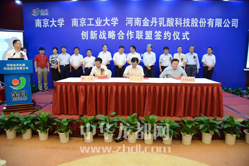 本报讯(记者 李莉) 7月9日上午,南京大学、南京工业大学、河南金丹乳酸科技股份有限公司创新战略合作联盟签约仪式在郑州举行。副省长张维宁,中国工程院院士张全兴,南京大学副校长谈哲敏,南京工业大学副校长乔旭,省科技厅厅长张震宇,市委书记、市人大常委会主任徐光,省环保厅副厅长师伟,市委常委、常务副市长刘保仓,市委常委、组织部长靳磊,副市长王田业,及郸城县主要领导、河南金丹乳酸公司主要负责人出席签约仪式。