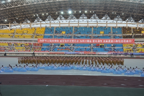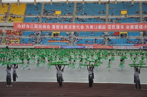 大型体育展示表演开始了,《印象周口》气势磅礴,来自周口幼儿师范学校和周口科技职业学院、沈丘县教体局等单位的演员们披着鲜明的旗帜,激情奔跑在宽阔的体育场上,迎风飘扬的旗帜让整个会场变成了蓝色海洋;周口职业技术学院卫生学院与周口文昌中学的朗诵表演《荷韵悠长》吟诵豪迈,响彻会场;周口市自行车协会联合川汇区、淮阳县、太康县等多个教体育一起表演的《崛起之路》更是体现了周口正在实现中国梦的征途上迅速崛起,书写着新的精彩篇章……