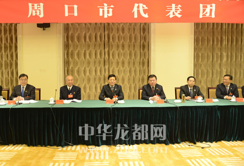 谢伏瞻同志和周口代表团成员一起讨论省委工作报告。 记者 王映 摄