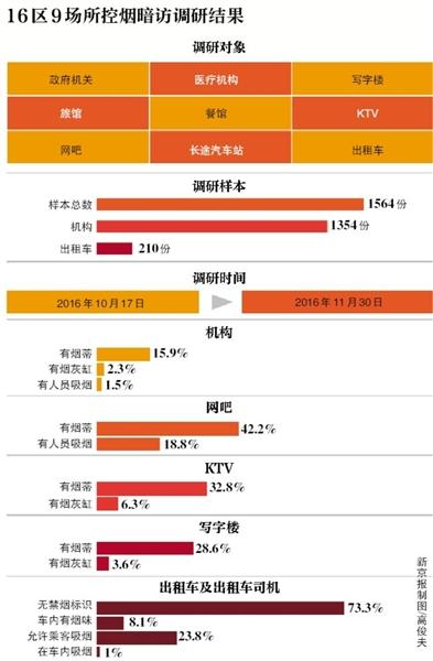 10月17日至11月30日,市爱卫办委托第三方专业调研公司,对16个区的政府机关、医疗机构、写字楼、旅馆、餐馆、KTV、网吧、长途汽车站、出租车等9类场所进行了暗访调研。调研共收集了1564份样本,其中机构样本1354份,出租车210份。