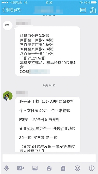 记者在前述QQ群里发现,有卖家给出的“批发价格”是:100张内3元一张;300张至500张为2.6元一张;500张至800张是2.3元一张;800张至1000张是2.1元一张;千张以上是1.9元一张。