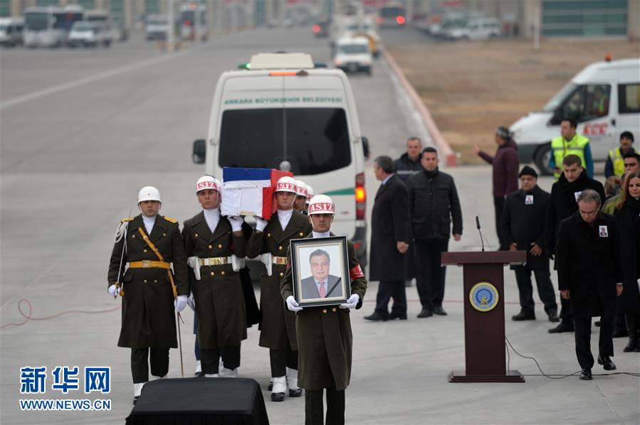 12月20日,俄罗斯驻土耳其大使安德烈·卡尔洛夫遗体告别仪式在土耳其首都安卡拉埃森博阿机场举行,其遗体于17时许被专机运往莫斯科。 新华社发(穆斯塔法·卡亚 摄)