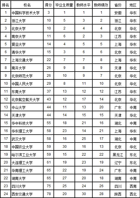 将满足上述3项条件的大学的3项排名名次相加后升序排列,得分越低越好。得分相同,教师平均学术水平高的大学居前。