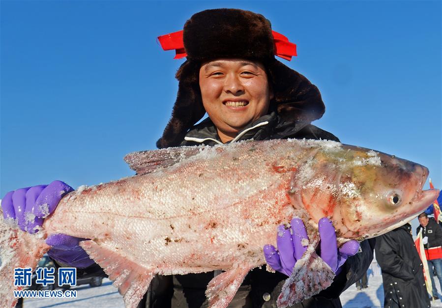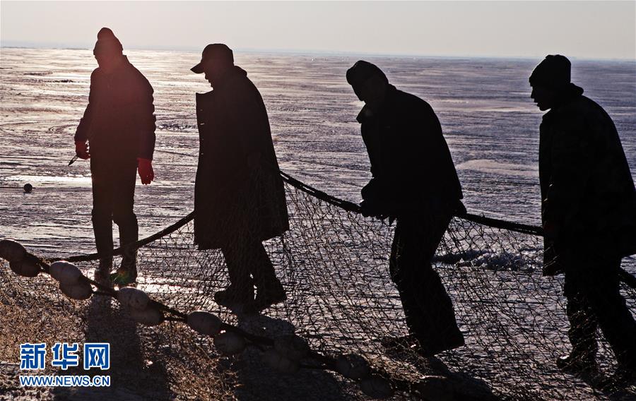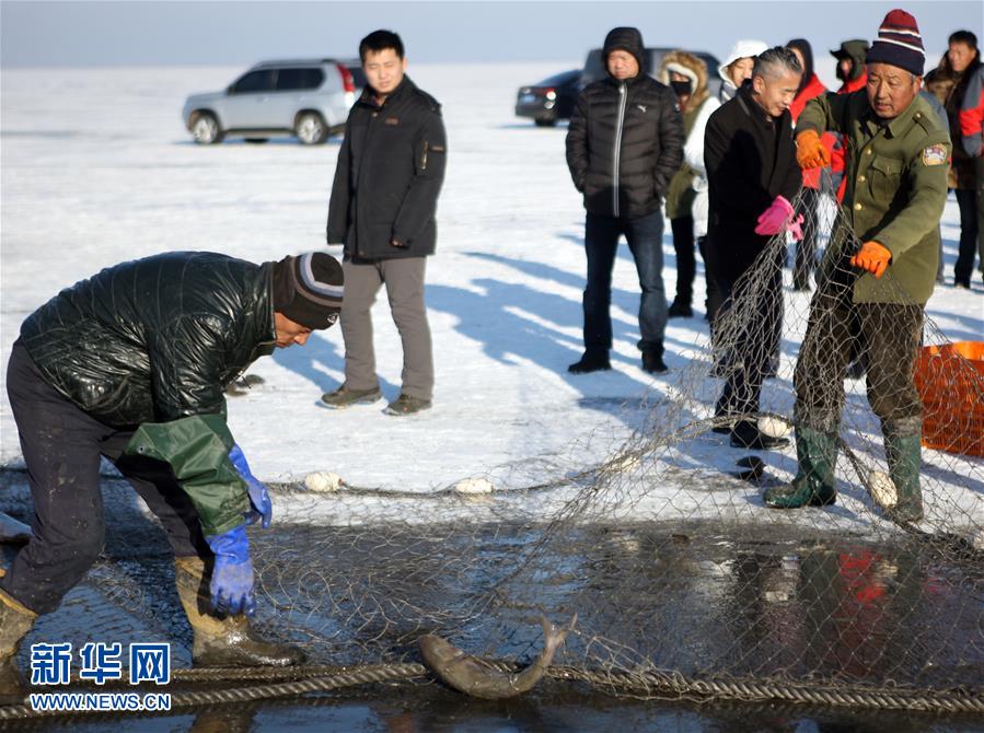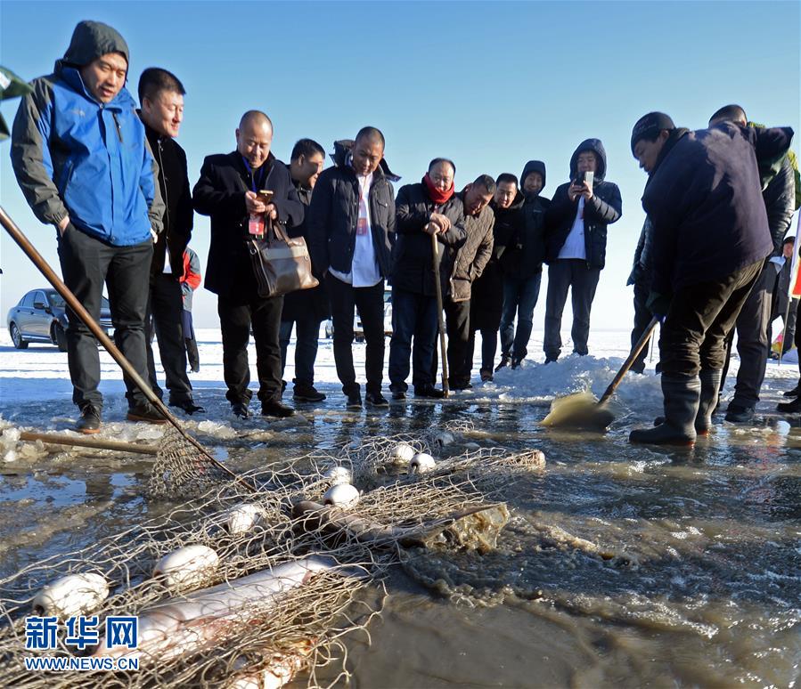 1月5日,渔民在康平卧龙湖捕鱼。当日,辽宁省康平县卧龙湖举行冬捕,精彩的传统捕鱼活动吸引了许多游客参观。 新华社发(龙雷 摄)
