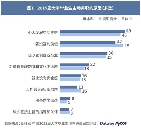 春节临近,意味着跳槽旺季又快来了,而那些刚刚毕业半年的大学生,他们在这个“跳槽季”会怎样选择呢?频繁跳槽又是否真的能让他们“升职加薪”?麦可思以2015届及2012届大学毕业生为样本,对大学毕业生的职业稳定性进行了分析。 超三成大学生毕业半年内离职,发展受限和薪资偏低是主因 研究显示,2015届大学毕业生毕业半年内的总体离职率为34%。其中,本科和高职高专院校2015届毕业生毕业半年内离职率分别为24%、43%。 从学科门类来看,在本科学科门类中,医学类2015届本科生毕业半年内离职率最低(12%),文学和农学最高(均为31%)。在高职高专专业大类中,医药卫生大类2015届高职高专生毕业半年内离职率最低(22%),艺术设计传媒大类最高(54%)。 进一步研究发现,2015届本科和高职高专毕业生毕业半年内离职的人群中,有98%是主动离职,主动离职的主要原因是“个人发展空间不够”(本科:49%,高职高专:46%)和“薪资福利偏低”(本科:42%,高职高专:48%)。
