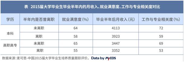 半年内未离职群体月收入和就业满意度更高 数据显示,2015届大学生毕业半年内曾离职群体的就业满意度(本科:58%,高职高专:55%)比半年内未离职群体(本科:64%,高职高专:65%)分别低6个百分点和10个百分点。月收入方面,半年内曾离职群体(本科:3923元,高职高专:3352元)比半年内未离职群体(本科:4113元,高职高专:3447元)分别低190元和95元。工作与专业相关度方面,半年内曾离职群体(本科:59%,高职高专:53%)比半年内未离职群体(本科:72%,高职高专:69%)分别低13个百分点和16个百分点。 综合来看,毕业半年内曾离职群体的月收入、就业满意度和工作与专业相关度更低。频繁离职可能影响就业质量,但另一方面,月收入低、就业满意度低、工作与专业相关度低的现状可能引发职场新人离职,寻找更适合自己的工作。