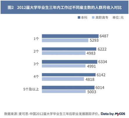 频繁跳槽不一定能换来高薪:雇主数越多,月收入越低 研究显示,2012届大学毕业生毕业三年内平均为2.2个雇主工作过。其中本科毕业生的平均雇主数为1.9个,有42%的本科毕业生三年内仅为1个雇主工作过,8%有4个及以上雇主。与本科毕业生相比,高职高专毕业生更换雇主较频繁,其平均雇主数为2.5个。仅有23%的高职高专毕业生三年内一直为1个雇主工作,而雇主数为4个及以上的高职高专毕业生则达到了18%。 不少毕业生离职是为了追求更高的薪资待遇,但跳槽是否真能助他们越跳越高? 仅从月收入方面来看,毕业生的职业忠诚度与其月收入大致成正比。在2012届本科毕业生中,毕业三年内一直为1个雇主工作的毕业生月收入最高,为6487元。工作过的雇主数越多,其月收入反而越低,为5个及以上雇主工作过的本科毕业生三年后月收入最低(6014元)。这一方面可能是因为毕业生在某一职位或行业的从业时间越久,涨薪的可能性越高,另一方面也有毕业生因对所在职位的薪资满意而降低离职意愿的可能。