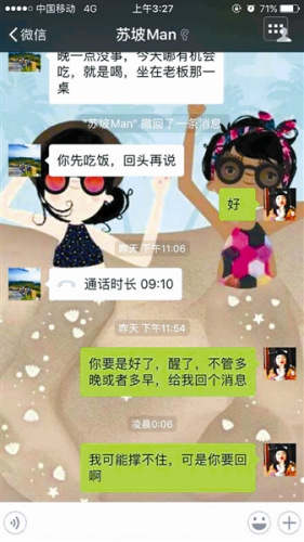 史国平与女友当晚的微信聊天 研究生送医后抢救无效 家属从史的室友处了解到,史国平在22时许回到宿舍,回去的路上他还吐了一次。 23时06分,史国平在宿舍里跟女友琪琪用微信语音打了一通电话,通话9分钟10秒。 23时54分,琪琪在微信里留言:“你要是好了,醒了,不管多晚或者多早,给我回个消息。”16日零点零6分,琪琪睡觉前留言“我可能撑不住,可是你要回啊”。 这些留言史国平都没看到。在挂掉电话后不久,他就倒在地上,室友见其异常后,立即联系学校的老师,后来用滴滴打车将其送医。史的舅舅韦先生说,学校方面“连120急救电话都没打”。 15日23时27分,史国平被送往镇江的三级甲等医院江滨医院抢救。 16日1时20分左右,医院宣告史国平抢救无效身亡,诊断结论为猝死。当韦先生和史国平的父母等人赶到医院时,史国平已无生命体征。 “聚餐我们不反对。但是老师在场,怎么能让学生喝酒?而且一喝喝这么多。”韦先生说。 史的母亲韦女士说,史国平“平时在家只喝一点啤酒,白酒根本不喝”。 身亡研究生即将读博士 史的老家在镇江市丹阳县农村,距江苏大学只有一小时车程,史国平学业不忙的时候,会在周末回家看望父母和爷爷奶奶。“他是独苗,很孝顺。很上进,也很争气。家里把他培养出来不容易。眼看他都要读博士了,人没了。” 在微信里,史国平的昵称是“苏坡man”,这是英语superman(意为“超人”)的谐音。从朋友圈里的文字,能看到他生前留下的痕迹。 9月29日,他说:“人生总是在纠结中度过,也是混蛋,也是无奈。” 10月13日,他转发了一条业内新闻《弃用内燃机德国迎来全电动时间表》,并说“可以有用武之地了”。 在杭州参加过电气科研领域的一次会议后,10月21日,他写下一段话:“千里迢迢,前来交流。与院士影,与大牛谈。科研之路,漫漫修远。杭州之行,回味良多。” 史国平的微信个人签名为:“优秀是第二等的选择,第一等的选择是自在。” 校方通报只字未提饮酒 1月17日晚,江苏大学学生工作处向当地媒体发送一份《关于我校学生史国平猝死的情况通报》。 通报称:“2017年1月15日晚,我校研究生史国平的导师邀请课题组同学,一起在校外举行寒假离校前的聚餐活动,聚餐活动至当日晚20时30分左右。 “随后,史国平与部分同学在餐厅聊天至22时15分左右,并与同学同行于22时50分走回自己宿舍。回到宿舍后,史国平与其女朋友通话约8分钟左右。之后,自己突然感觉不适,同室2名同学发现后,立即组织同学于23时27分送往(镇江)江滨医院(镇江三级甲等综合医院之一)抢救,并向学校相关老师、领导报告。史国平所在学院的领导、导师及辅导员第一时间到达医院,并要求医院全力抢救。辅导员了解情况后,及时通知史国平父母,请其尽快赶来医院。抢救至次日凌晨1时20分左右,医院宣告史国平抢救无效身亡,诊断结论为猝死。” 北青报记者注意到,江苏大学的这份通报只字未提“喝酒”一事。 18日上午,北青报记者打通江苏大学宣传部部长办公室电话,一名值班老师表示,事情还在处理。北青报记者询问:是否调查喝酒情况?相关老师有无责任?该名老师称“不是你说的那样”,北青报记者请校方对此作出回应,该老师称“不了解情况”,随后挂断电话。 18日晚,史国平的导师朱教授给北青报记者打来电话,介绍了当晚饭桌上的情况。朱教授称,在饭桌上,他并没有给学生劝过酒,因为饭桌上串来串去,他确实不知道当时史国平喝了多少。朱教授说:“我自己有胃溃疡,不喝白酒,只喝了一点黄酒。我不可能劝别人喝。” 朱教授称,从当晚饭局上的情况看,史国平比较兴奋,目前还不清楚导致他死亡的真正原因。“史国平是我的好学生,因为他品学兼优,我才推荐保送博士生的。他的父母知道我对他有多好。这是我破天荒第一次遇到这样的事。最好的学生失去了,我的心情也不好。” 截至发稿前,史国平的家属表示,目前校方已与他们就善后事宜初步达成一致。 |