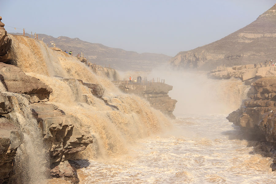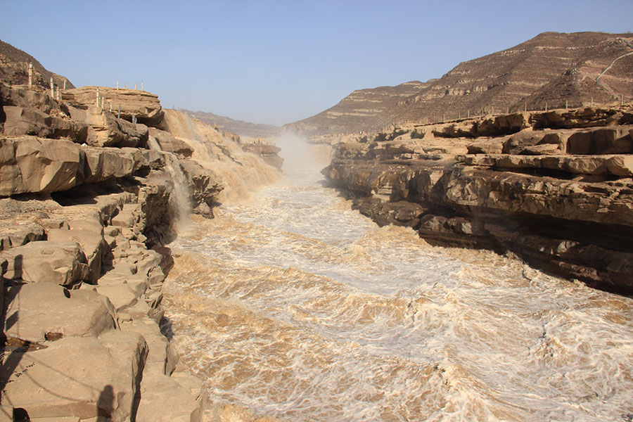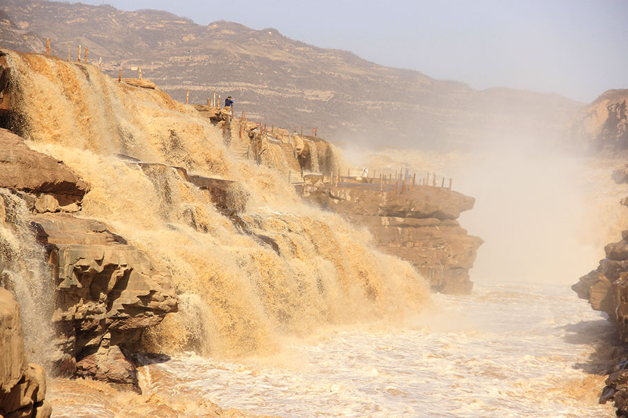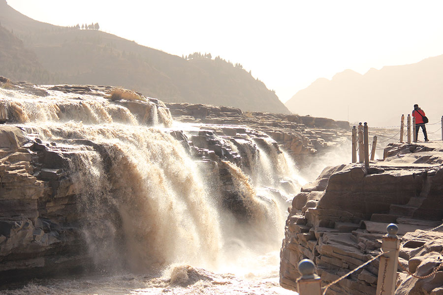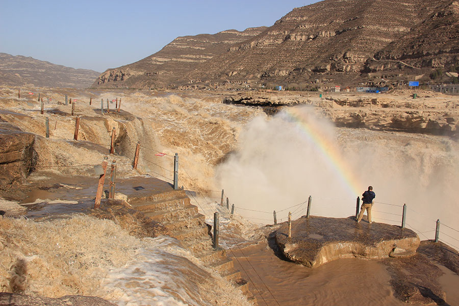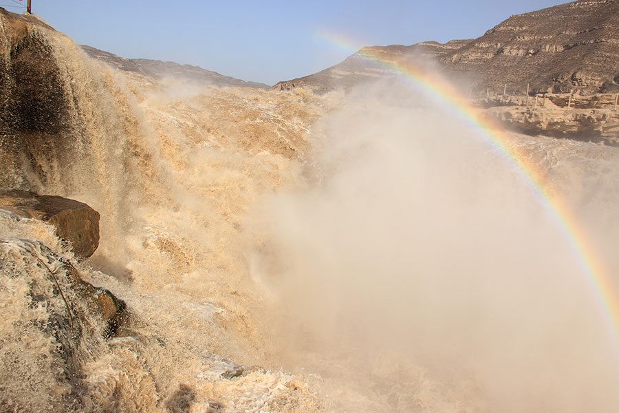 黄河壶口瀑布位于宜川县东35公里处,两岸高山对峙,黄河穿行于秦晋大峡谷之中,当流至壶口时宽约400多米的河床,突然收缩到四五十米宽,这时河水奔腾怒啸,山鸣谷应,形如巨壶沸腾,最后从20余米高的断层石崖飞泻直下,跌入30余米宽的石槽之中,听之如万马奔腾,视之如巨龙鼓浪,波浪翻滚,惊涛怒吼,震声数里。壶口瀑布不同的季节、不同的时间、不同的水流有着梦幻般的变化,形成了奇绝壮观的八大景观:“烟从水底升,船在旱地行,未霁彩虹舞,晴空雨濛濛,旱天鸣惊雷,危岩挂冰峰,海立千山飞,十里走蛟龙。成雪峰/摄