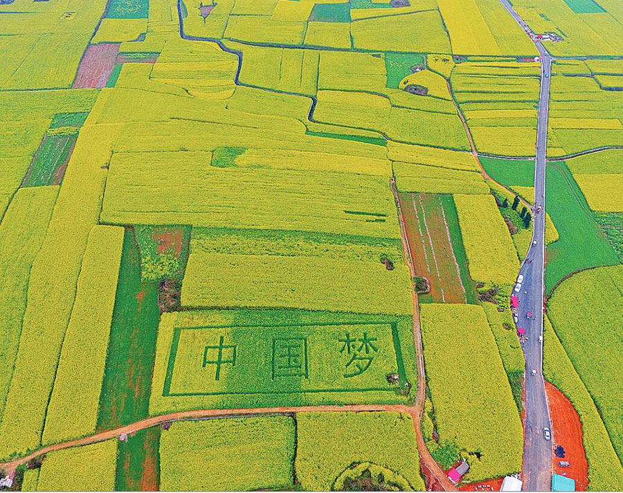 近年来,云南省罗平县板桥镇金鸡村积极利用油菜花田,大力发展乡村旅游,走上脱贫致富道路。图为2月11日,当地村民在油菜花田中种出的“中国梦”字样。毛虹/摄