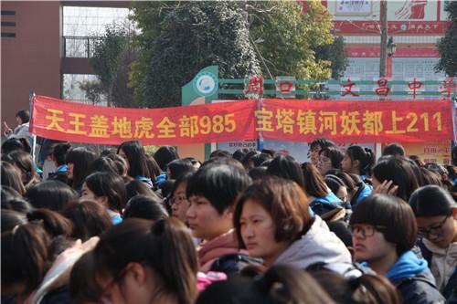 会场两边的励志标语写着:“天王盖地虎全部985,宝塔镇河妖都上211”、“挑战高考极限,梦想成就明天”、“奋战百日,品尝成功的喜悦”…… 高三阶段的学子代表还上台通过做俯卧撑的方式,给自己加油。
