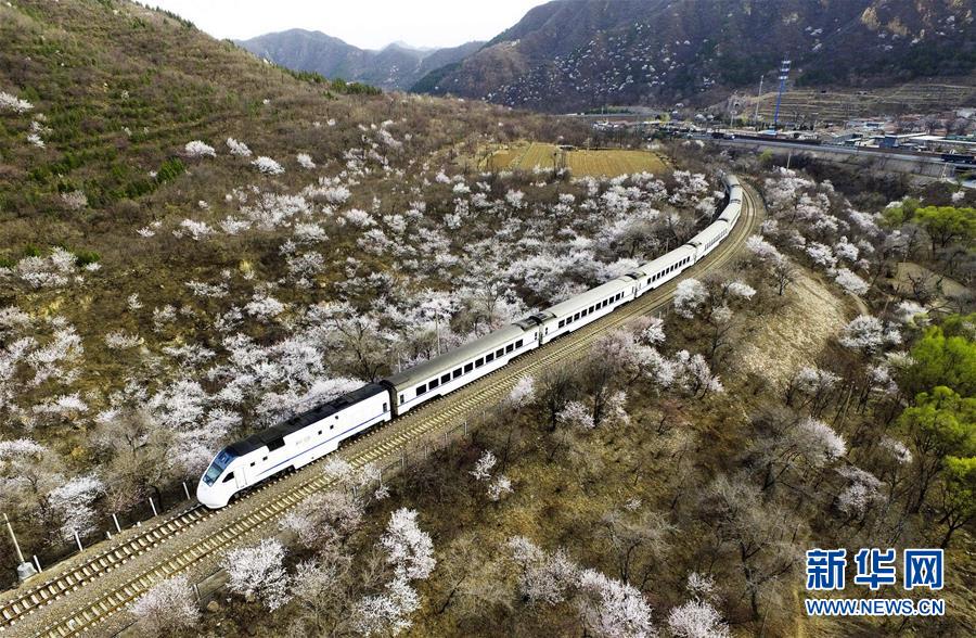 一列火车在北京居庸关附近的山花中穿行(2016年3月28日摄)。 新华社记者鞠焕宗 摄