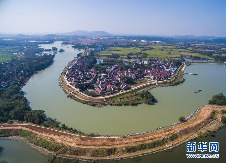 俯瞰整治完成的浙江省安吉县西苕溪荆湾段,西苕溪水系最后汇入太湖(2016年11月3日摄)。