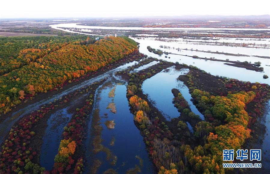 俯瞰珍宝岛湿地局部(2016年9月28日摄)。