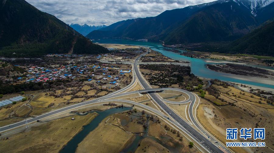 俯瞰西藏林芝境内的拉林高等级公路(2016年4月4日摄)。