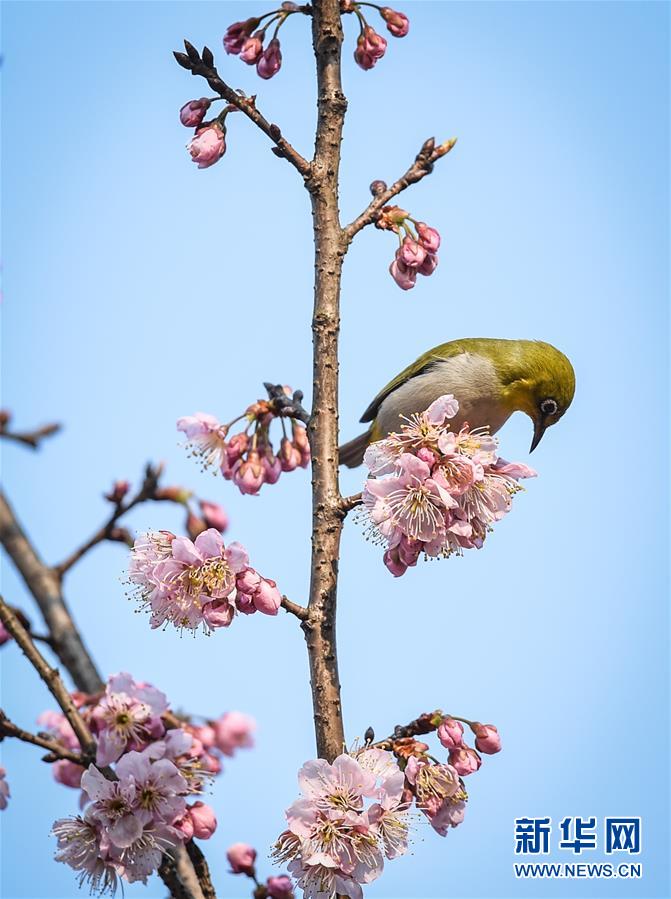 2月28日,一只绣眼鸟停在一株樱花上。近日,天气回暖,南京中山植物园内樱花盛开。鸟儿与樱花构成春日美景,吸引不少摄影爱好者前来拍照。 新华社记者杨磊 摄